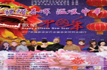 中國藝術家春節慰問代表團過去二十年來, 已跨越歐洲丶美洲及澳洲, 在20餘國家和地區的80座城市, 為當地的華人華僑帶來祖國人民的問候和藝術家們的精彩表演。在春節宣慰活動中, 已逾150位中國藝術家給海外的華人華僑及民眾提供了豐盛的春節文化饗宴。 2017年中國藝術家春節慰問代表團將由郭冬臨丶羅中旭 丶李菁丶郭天翼丶呼斯楞丶烏蘭圖雅丶楊東雨丶金美兒丶李殊丶桐瑤 等大腕明星赴美演出。首站抵舊金山, 於2017年1月29日(星期日) 晚上7時在南灣Cupertino市佛林中心表演, 當天節目內容有歌唱和相聲, 演出精采, 是一場熱鬧的春節晚會。