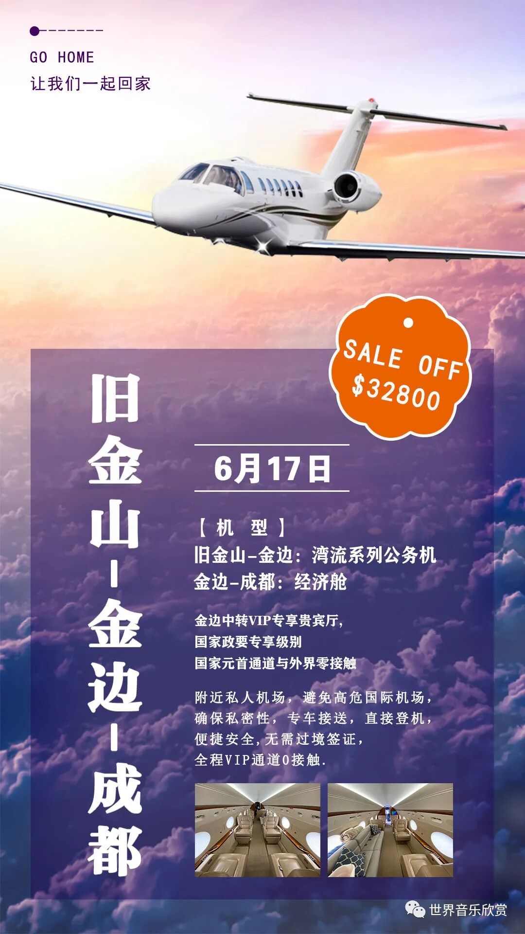 獨家航線,從美國起飛搭乘灣流私人商務包機,舒適寬敞,在金邊轉機換乘民航商務艙抵達國內,確保私密性。
